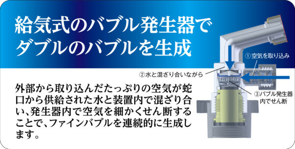 この製品の最大の特徴は、独自の技術によって「ウルトラファインババブル」と「マイクロバブル」という2種類の微細気泡を同時に発生させる点にあります。